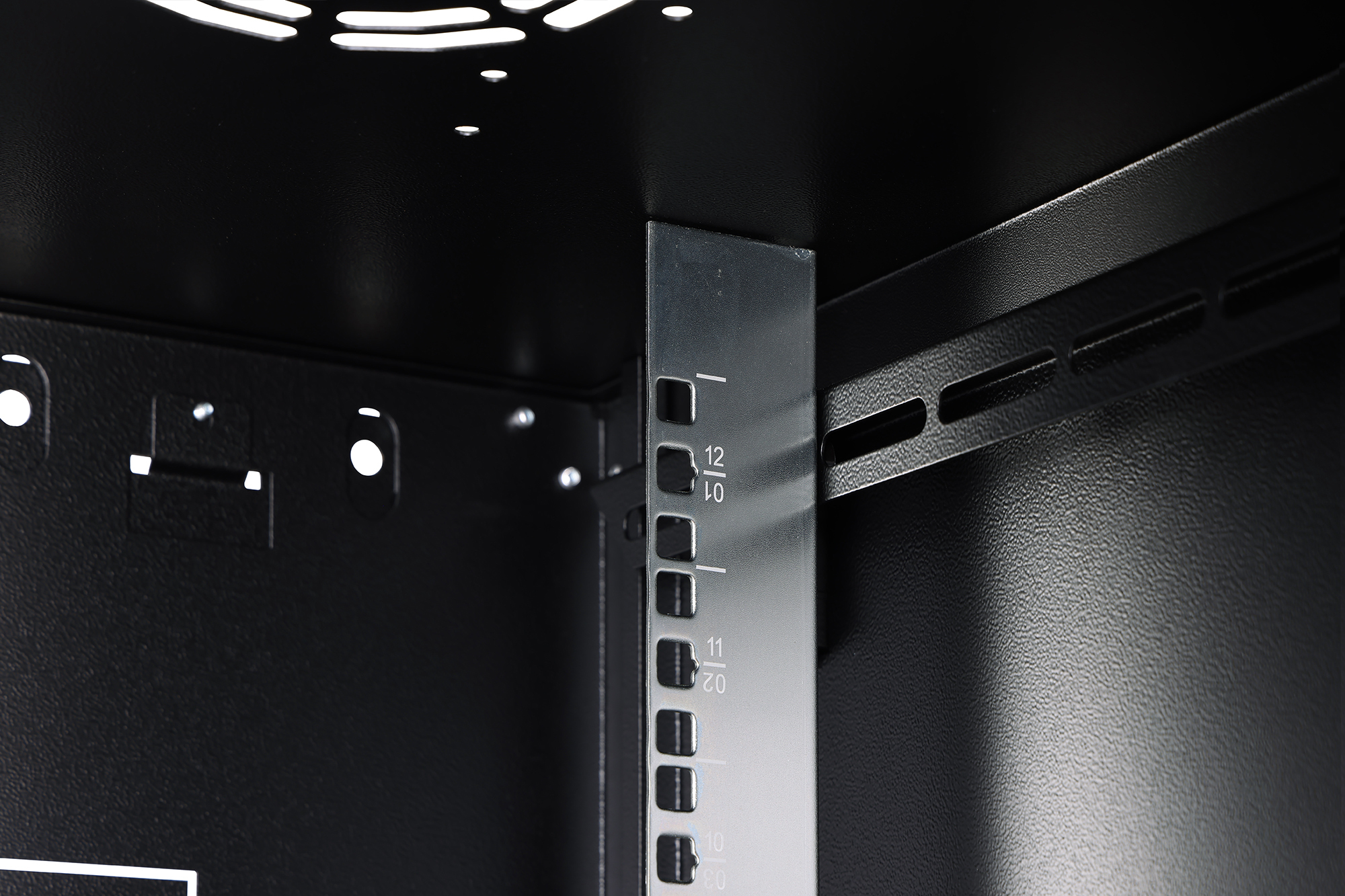 483 mm (19“)-Profilschienen an der Vorder- und Rückseite innerhalb des Schrankes montiert, galvanisiert