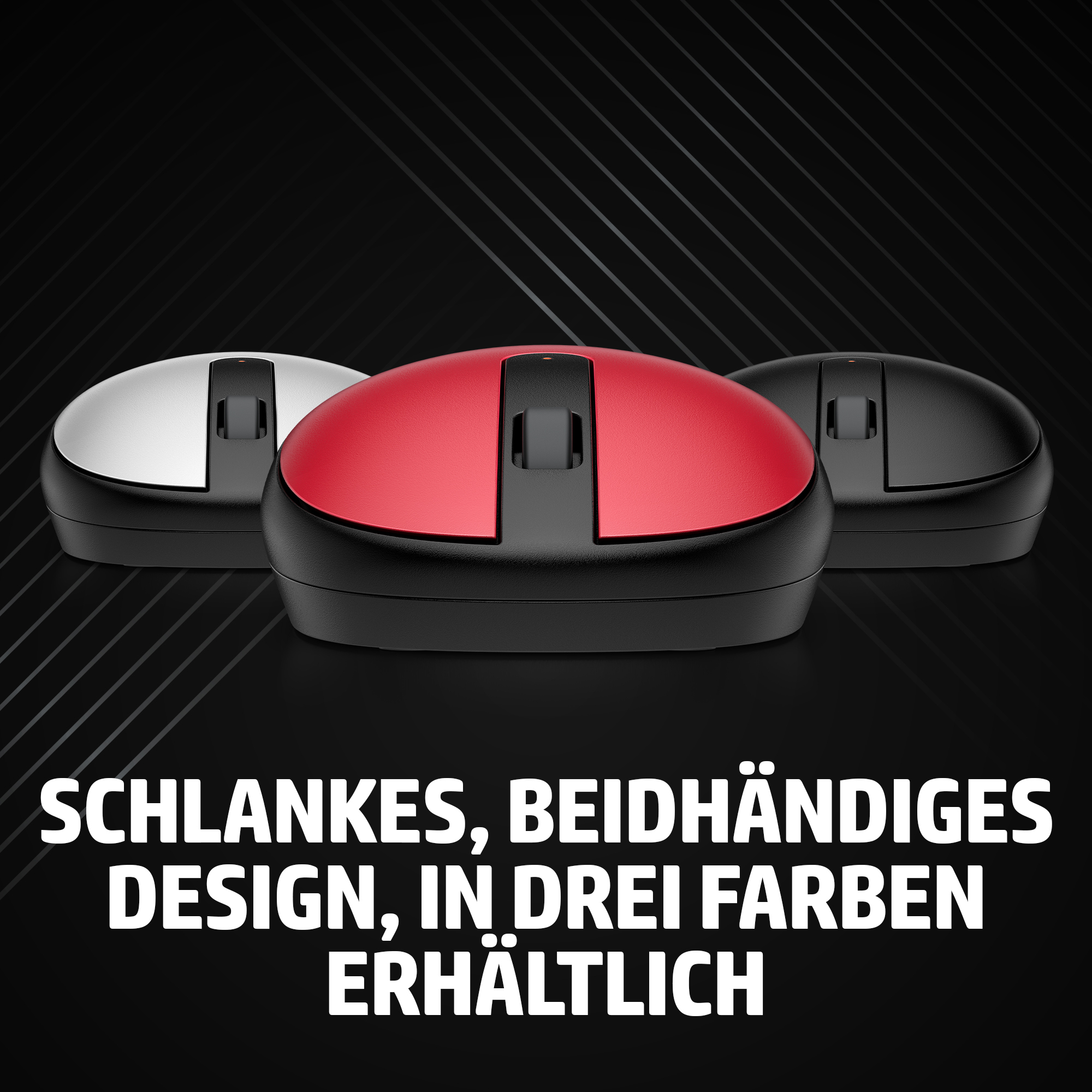 Schlankes, beidhändiges Design. Wähle aus drei stilvollen Farben aus: Schwarz, Rot oder Silber. Sie verfügt auch über drei Tasten und ein Scrollrad.
