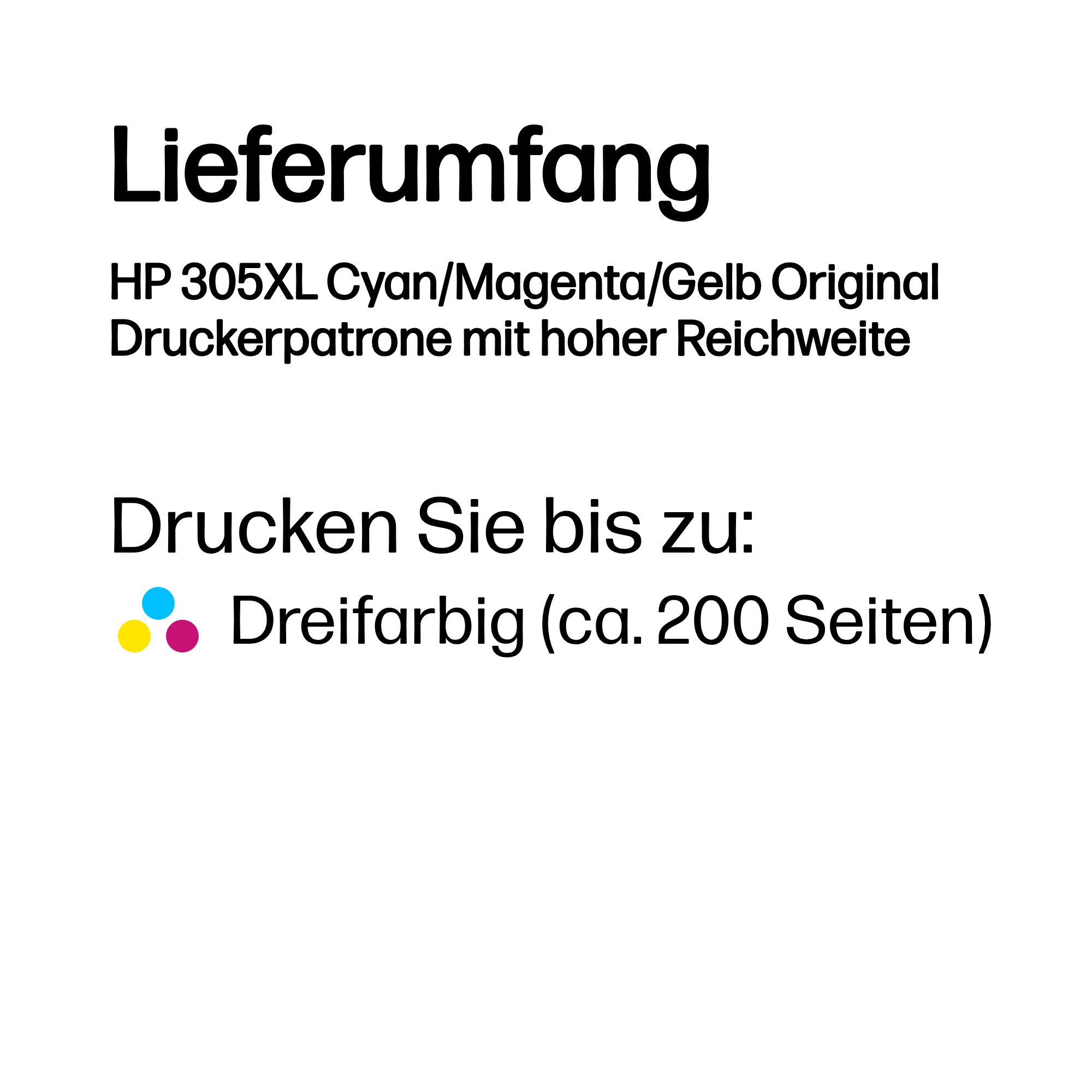 | Packungsinhalt | HP 305XL Cyan/Magenta/Gelb Original Druckerpatrone mit hoher Reichweite |