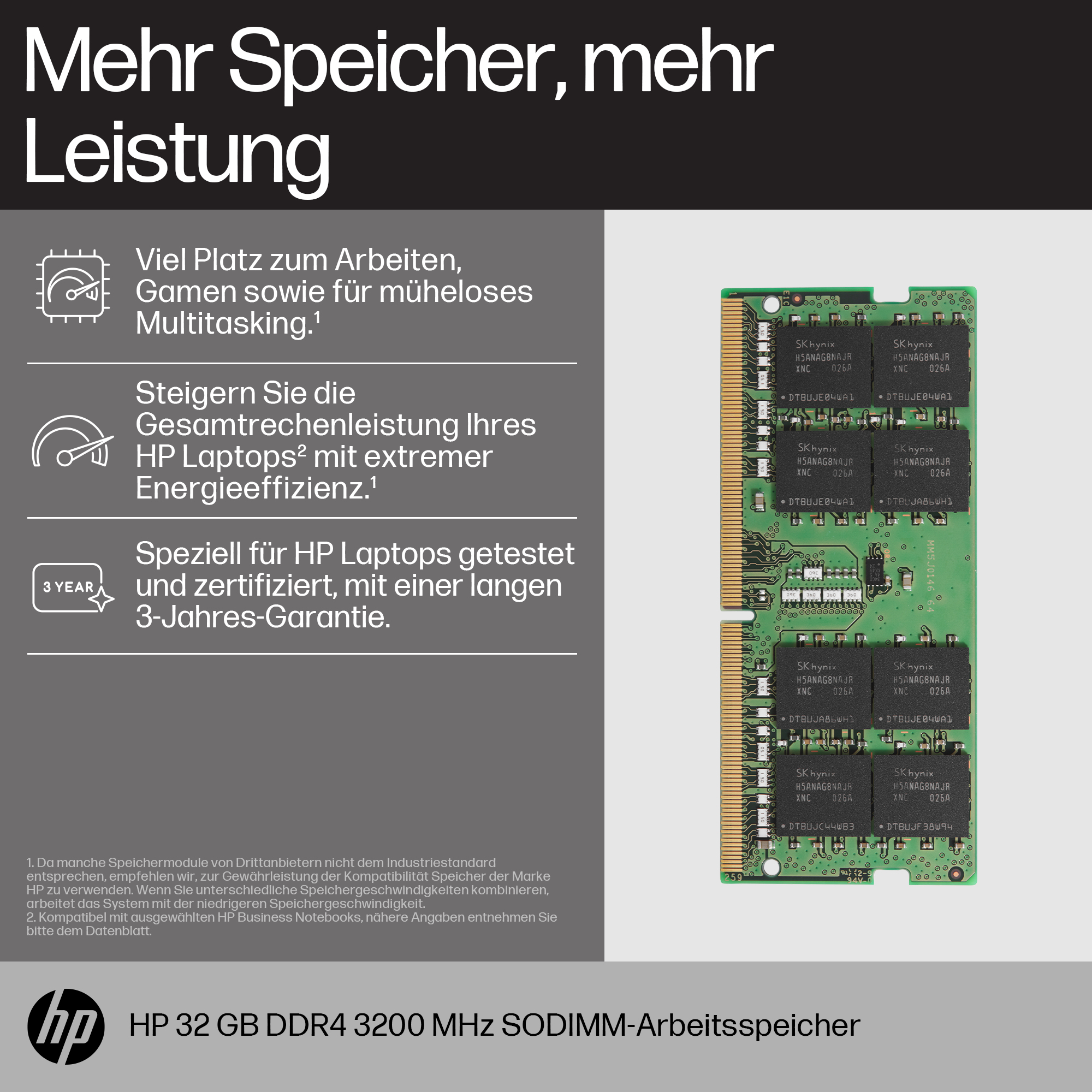 Investieren Sie in Originalspeicher der Marke HP – für HP Laptops getestet, zertifiziert und gebaut. Dieses Produkt ist stabil und zuverlässig, und beinhaltet eine umfassende Garantie über 3 Jahre, für alle Fälle.