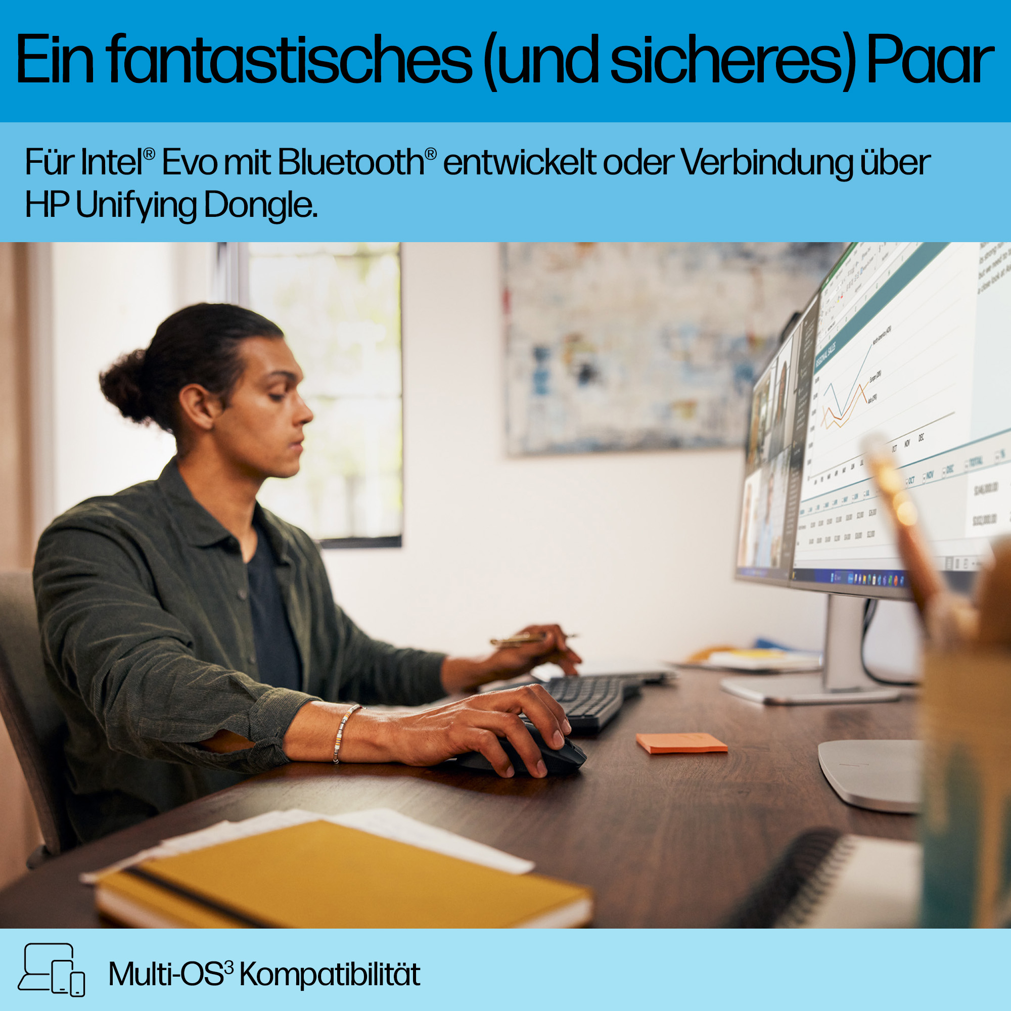 Keine Sorge: Die Dual-Mode-Tastatur und -Maus synchronisieren sich problemlos mit einer Reihe von Geräten. Nahtloses Bluetooth® und der zuverlässige HP Unifying Dongle schützen alles, was Sie verbinden. Für Intel® Evo™ Geräte entwickelt und mit mehreren Betriebssystemen<sup>[2]</sup> kompatibel für einen reibungsloseren und sichereren Workflow im laufenden Betrieb.