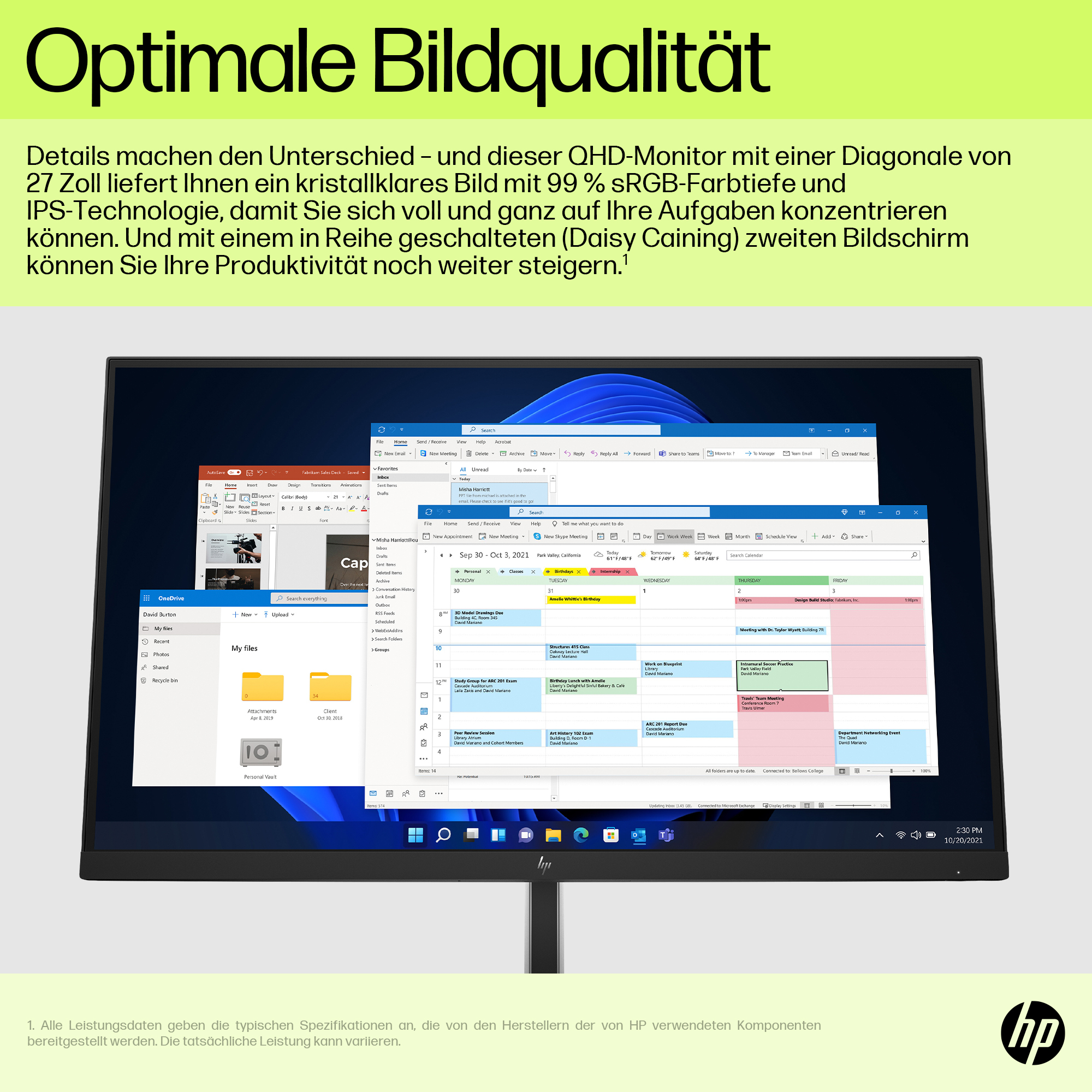 Mit seiner perfekten Detailtreue bietet dieser QHD-Monitor mit 68,6 cm (27 Zoll) Bildschirmdiagonale die Klarheit, die Sie benötigen, um sich auf Ihre Aufgaben zu konzentrieren. Die reichhaltige sRGB-Farbtiefe und die IPS-Technologie[1] liefern klare, lebensechte Farben in einem breiten Betrachtungswinkel[2]. Daisy Chaining bietet Ihnen die Möglichkeit, Ihren Bildschirmbereich mithilfe eines zweiten Monitors noch stärker zu erweitern.