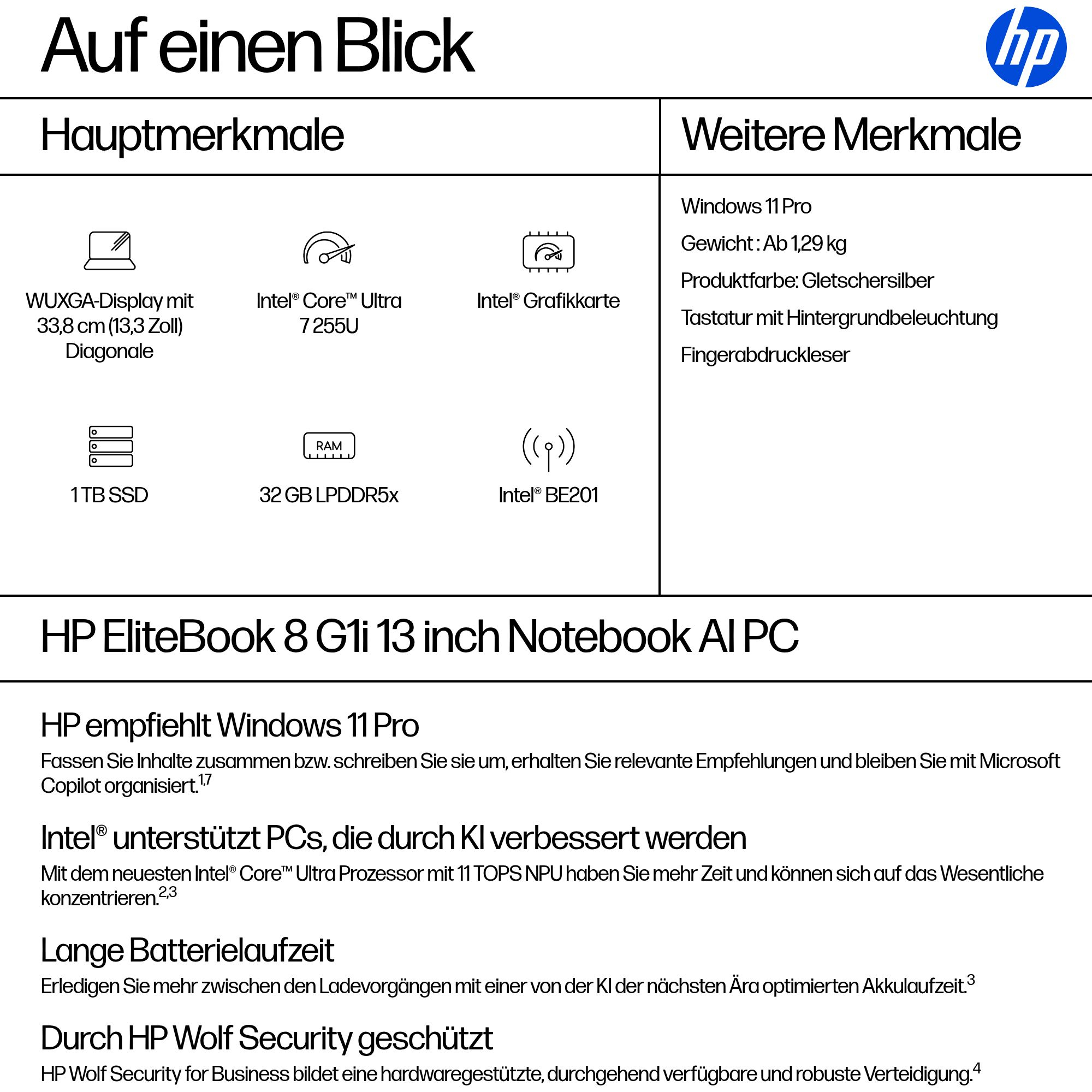 HP EliteBook 8 G1i AI PC Intel Core Ultra 7 255U Laptop 33,8 cm (13.3") WUXGA 32 GB LPDDR5x-SDRAM 1 TB SSD Wi-Fi 7 (802.11be) Windows 11 Pro Silber