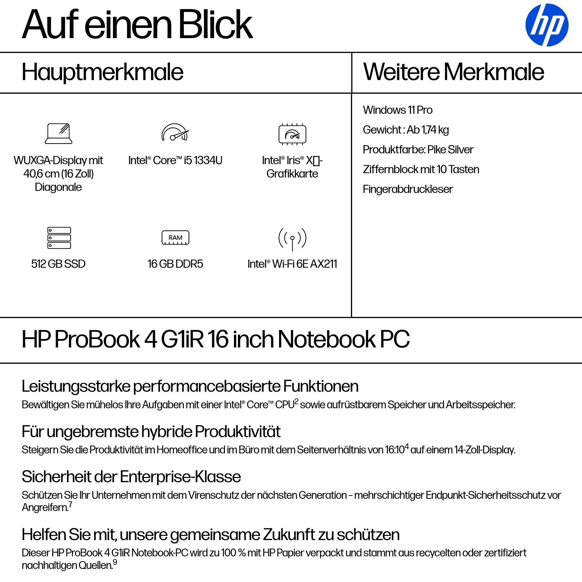 HP ProBook 4 G1iR Intel® Core™ i5 i5-1334U Laptop 40,6 cm (16") WUXGA 16 GB DDR5-SDRAM 512 GB SSD Wi-Fi 6E (802.11ax) Windows 11 Pro Silber