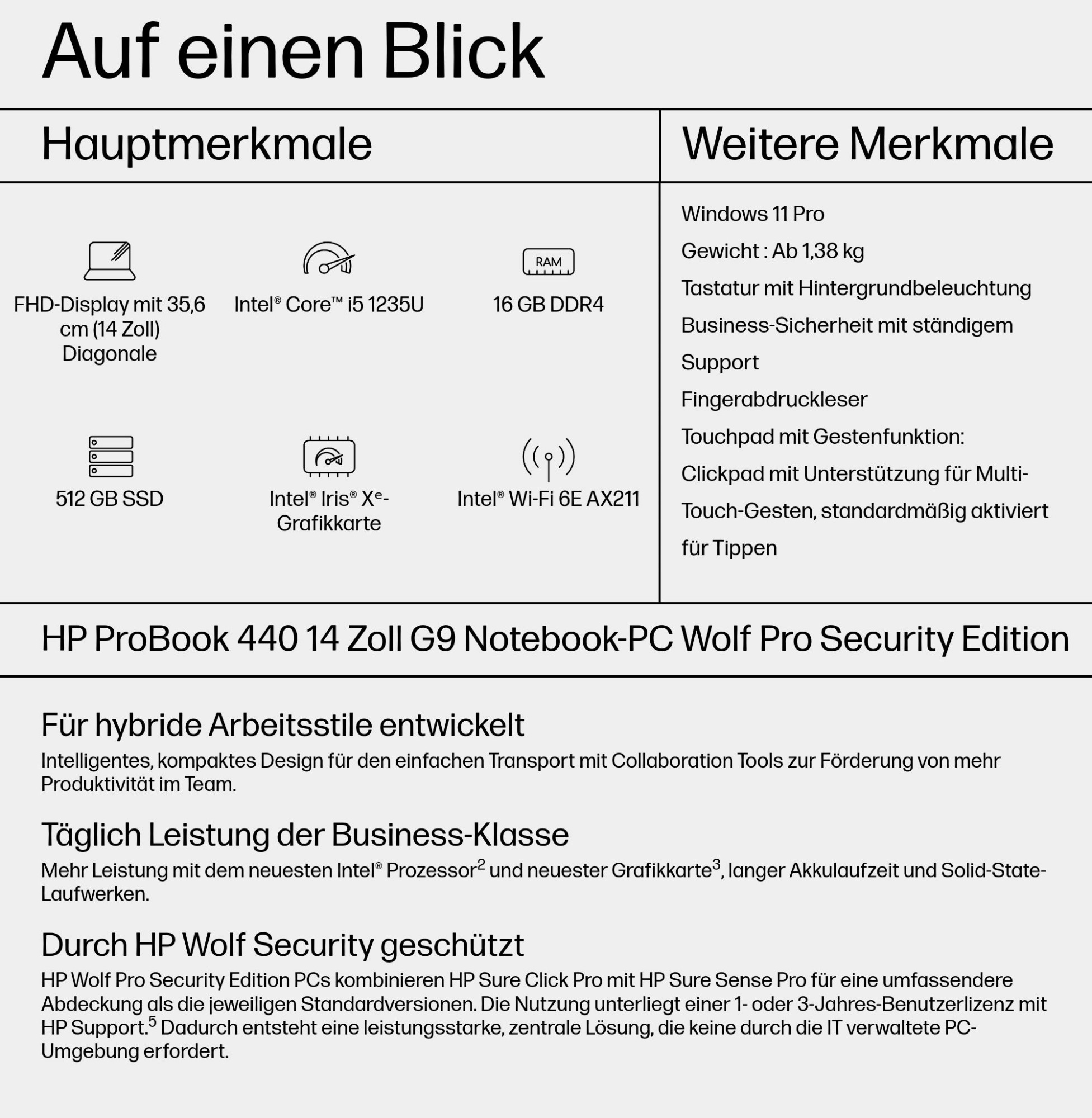 HP ProBook 440 G9 Intel® Core™ i5 i5-1235U Laptop 35,6 cm (14") Full HD 16 GB DDR4-SDRAM 512 GB SSD Wi-Fi 6E (802.11ax) Windows 11 Pro Silber