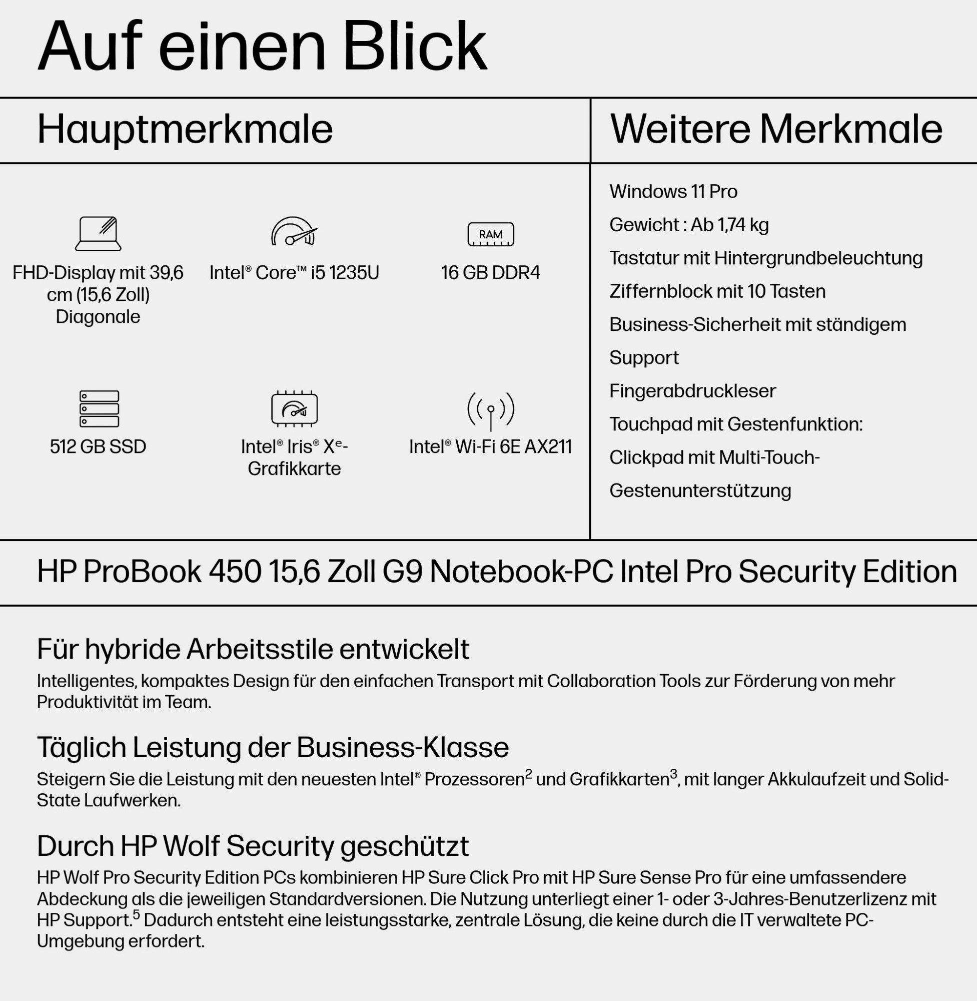 HP ProBook 450 G9 Intel® Core™ i5 i5-1235U Laptop 39,6 cm (15.6") Full HD 16 GB DDR4-SDRAM 512 GB SSD Wi-Fi 6E (802.11ax) Windows 11 Pro Silber