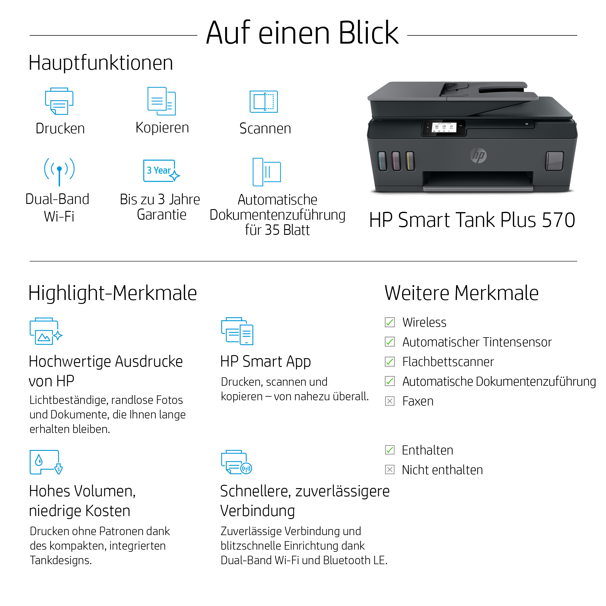 | Packungsinhalt | HP Smart Tank Plus 570; 2 x HP 32XL Schwarz Original Tintenflasche, 135 ml; HP 31 Cyan Original Tintenflasche; HP 31 Magenta Original Tintenflasche; HP 31 Gelb Original Tintenflasche; Flyer mit Sicherheitshinweisen zur Tinte; Flyer mit Umpackungshinweisen; Installationsanleitung; Referenzhandbuch; Flyer mit regulatorischen Angaben; PT-Flyer; Flyer mit regulatorischen Angaben zur RoH-EAC; Flyer zur verlängerten Garantiefrist; Netzkabel; Weitere Informationen zu Füllstand und Reichweite finden Sie unter http://www.hp.com/go/learnaboutsupplies |