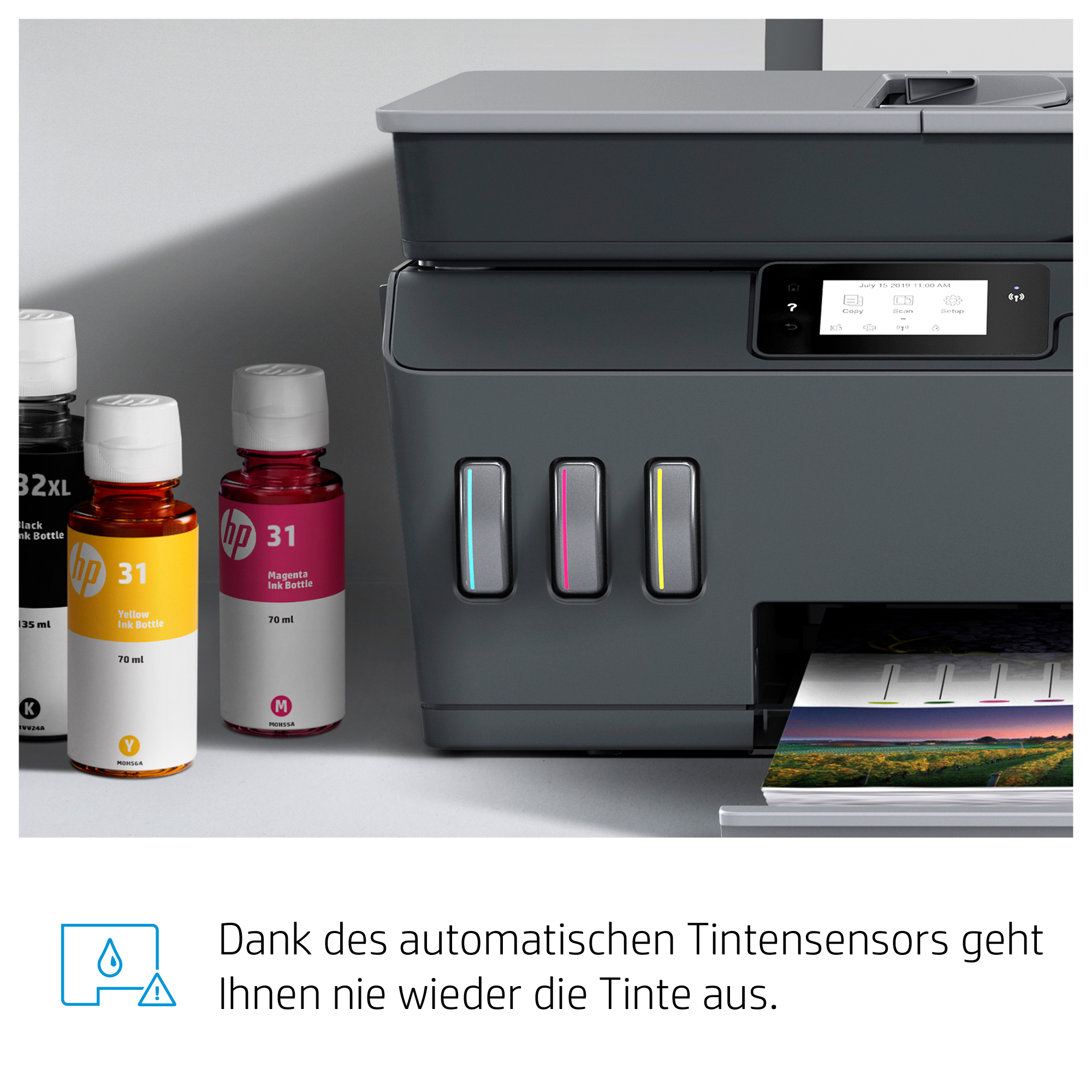 | Ersatzpatronen | HP 32 Schwarz Original Tintenflasche, 90 ml 1VV25AE; HP 31 Cyan Original Tintenflasche, 70 ml 1VU26AE; HP 31 Magenta Original Tintenflasche, 70 ml 1VU27AE; HP 31 Gelb Original Tintenflasche, 70 ml 1VU28AE; HP 32XL Schwarz Original Tintenflasche, 135 ml 1VV24AE. Weitere Informationen zu Füllstand und Reichweite finden Sie unter http://www.hp.com/go/learnaboutsupplies |
