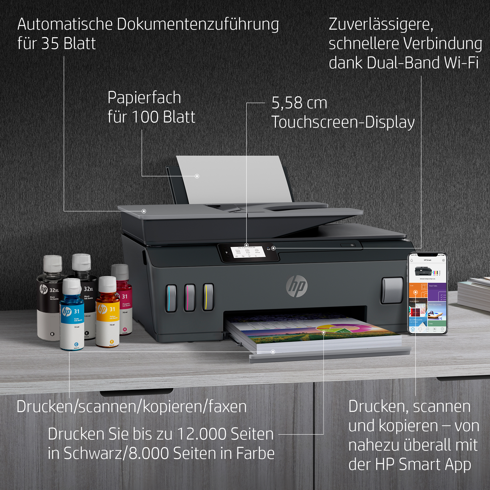 Dokumente schnell drucken – bis zu 38 % schnellere Druckgeschwindigkeit im Vergleich zum vorherigen HP Smart Tank.[6] Schnelles Arbeiten mit der automatischen 35-Seiten-Zuführung.
