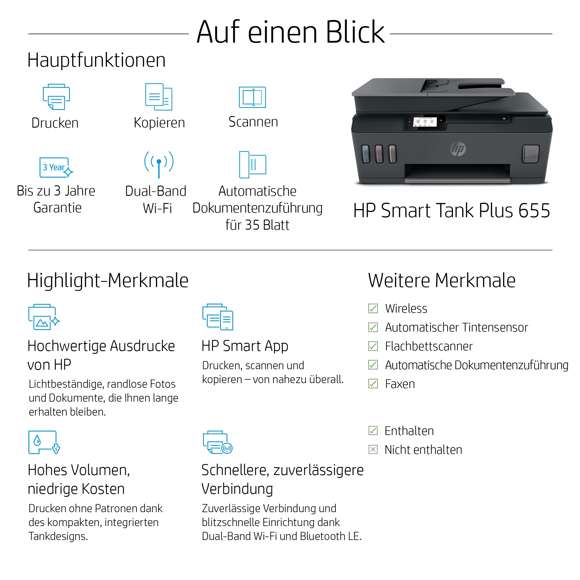 | Packungsinhalt | HP Smart Tank Plus 655 Wireless All-in-One; 2x HP 32XL Schwarz Original Tintenflasche, 135 ml; HP 31 Cyan Original Tintenflasche, 70 ml; HP 31 Magenta Original Tintenflasche, 70 ml; HP 31 Gelb Original Tintenflasche, 70 ml; Flyer mit Sicherheitshinweisen zur Tinte; Flyer mit Umpackungshinweisen; Installationsanleitung; Referenzhandbuch; Flyer mit regulatorischen Angaben; PT-Flyer; Flyer mit regulatorischen Angaben zur RoH-EAC; Netzkabel (Weitere Informationen zu Füllstand und Reichweite finden Sie unter http://www.hp.com/go/learnaboutsupplies) |