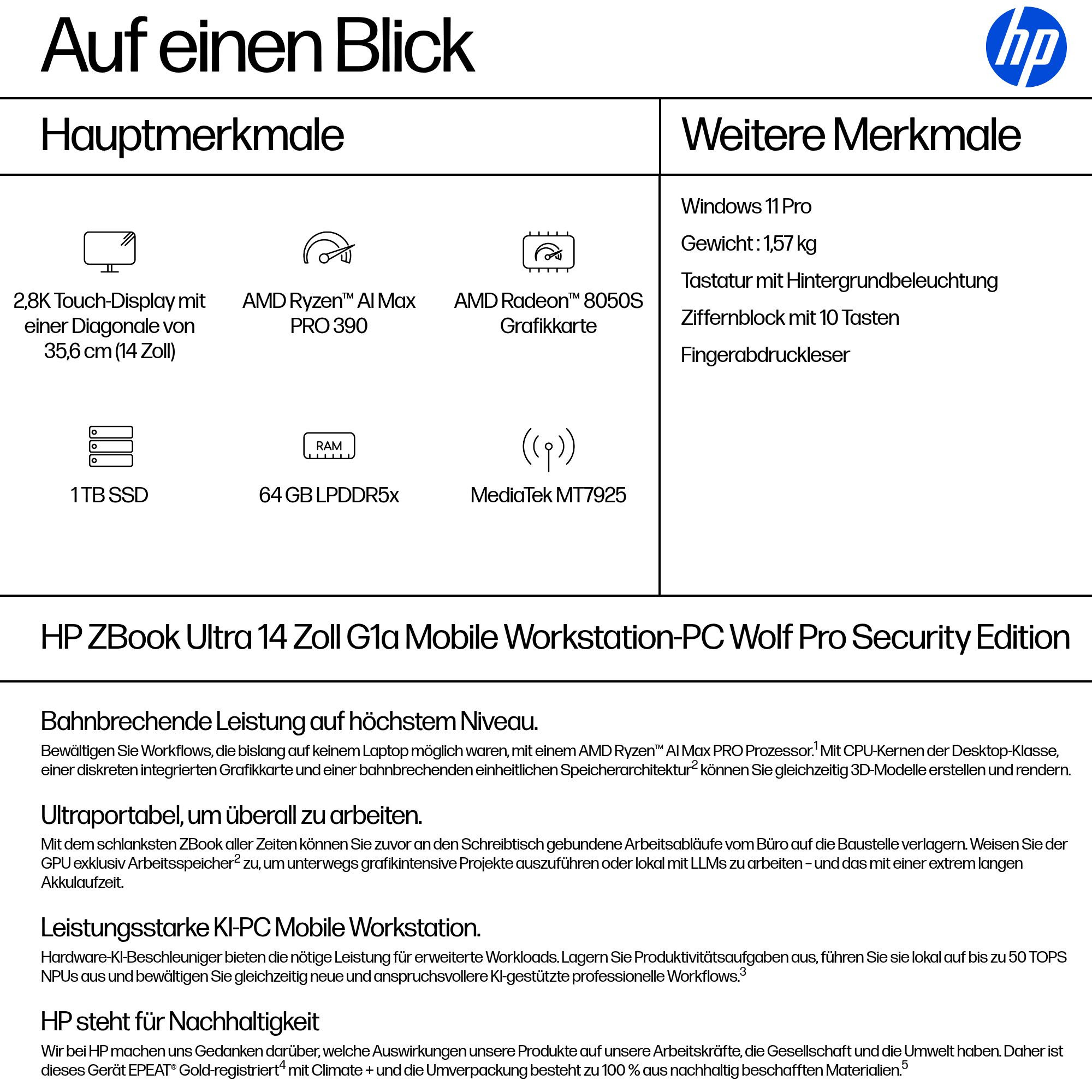 HP ZBook Ultra G1a Wolf Pro Security Edition Copilot+ PC AMD Ryzen AI Max PRO 390 Mobiler Arbeitsplatz 35,6 cm (14") Touchscreen 2.8K 64 GB LPDDR5x-SDRAM 1 TB SSD Wi-Fi 7 (802.11be) Windows 11 Pro AI Workstation, AI PC Silber