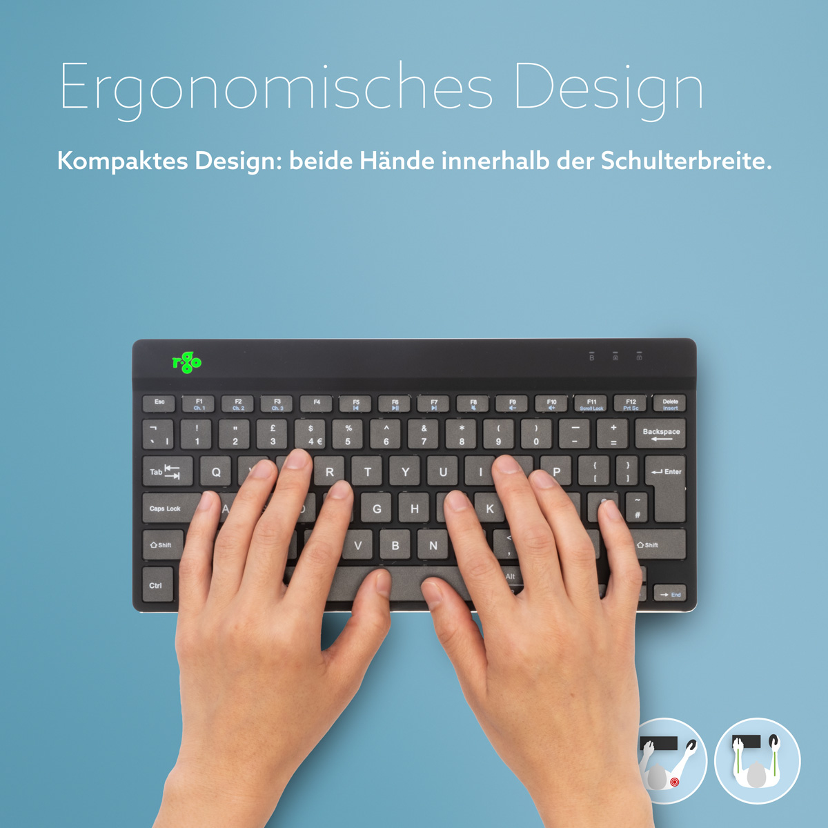 Die kompakte Tastatur sorgt dafür, dass die beide Hände beim Arbeiten in Schulterbreite bleiben. Diese natürliche Körperhaltung fördert die Schultern zu entspannen. Ideal in Kombination mit der R-Go Nummernblock Break. Sie sind leicht mitzunehmen. So können Sie überall gesund arbeiten!