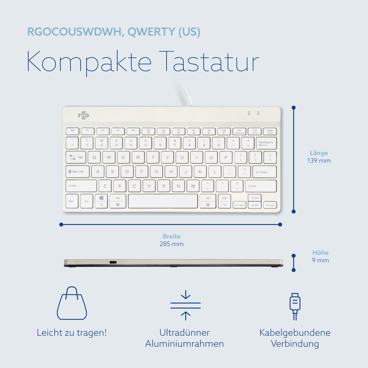 R-Go Tools Ergonomische Tastatur R-Go Compact Break, kompakte Tastatur mit Pausensoftware, QWERTY (US), Kabelgebunden, Weiß
