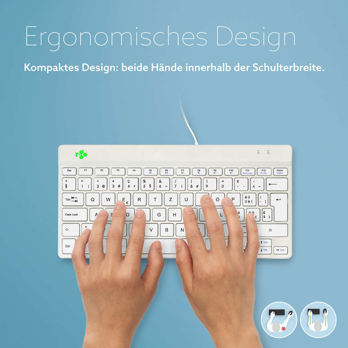Die kompakte Tastatur sorgt dafür, dass die beide Hände beim Arbeiten in Schulterbreite bleiben. Diese natürliche Körperhaltung fördert die Schultern zu entspannen. Ideal in Kombination mit der R-Go Nummernblock Break. Sie sind leicht mitzunehmen. So können Sie überall gesund arbeiten!