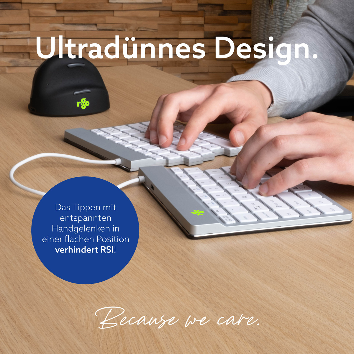 Die Split Tastatur ist ultradünn, damit die Sehnen und Blutgefäßen in den Handgelenken beim Tippen nicht eingeklemmt werden. Der spezielle Scherenmechanismus in den Tasten sorgt für einen leichten Tastenanschlag, sodass bei Betätigung der Tasten weniger Anstrengung benötigt ist. Deshalb sind die Finger beim Tippen entspannter.