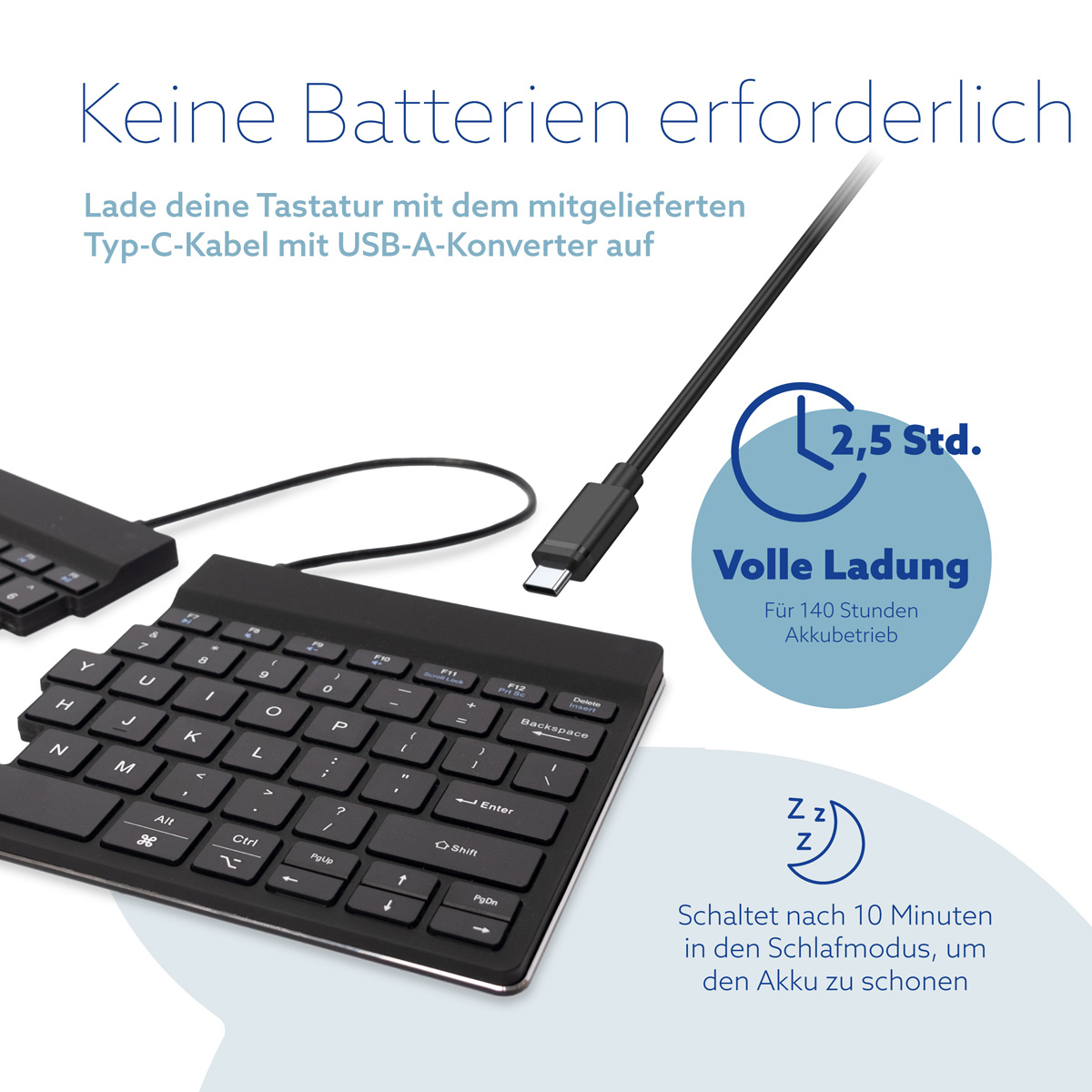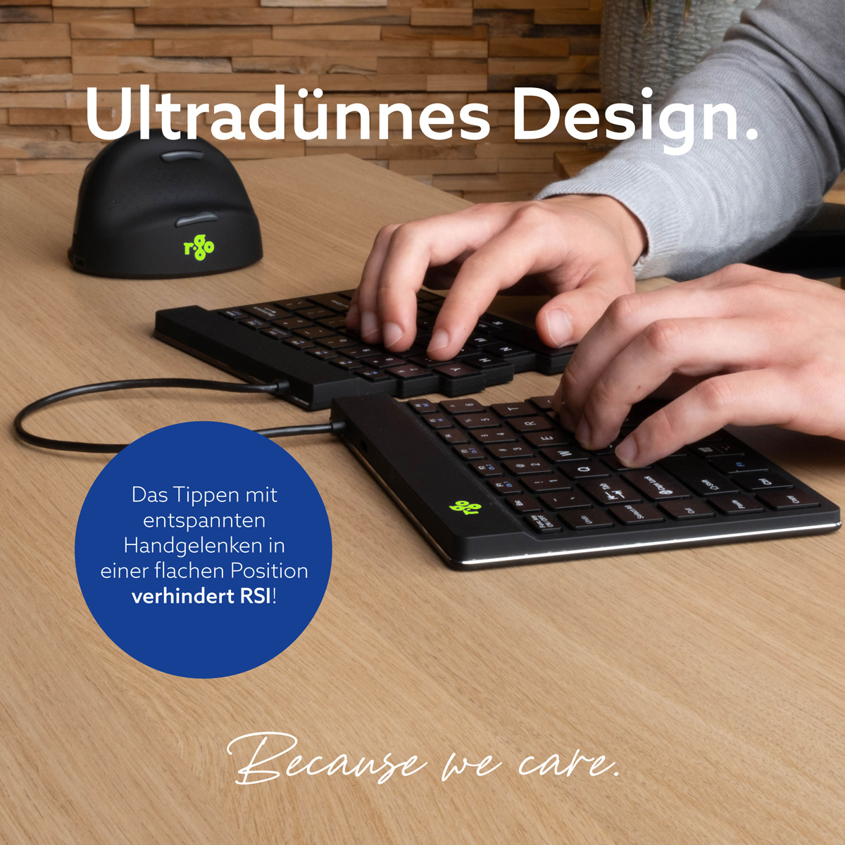 Die Split Tastatur ist ultradünn, damit die Sehnen und Blutgefäßen in den Handgelenken beim Tippen nicht eingeklemmt werden. Der spezielle Scherenmechanismus in den Tasten sorgt für einen leichten Tastenanschlag, sodass bei Betätigung der Tasten weniger Anstrengung benötigt ist. Deshalb sind die Finger beim Tippen entspannter.