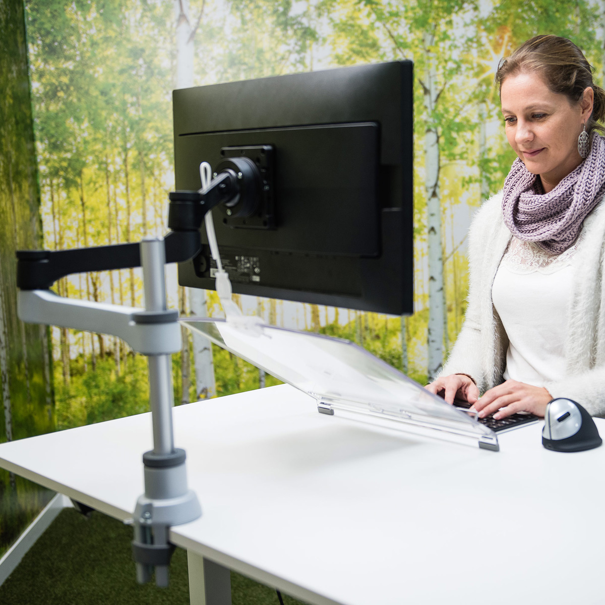Wenn Sie während der Bildschirmarbeit mit Papierdokumenten arbeiten möchten, ist der R-Go Morelia Dokumentenhalter sehr geeignet. Sie können diesen Dokumentenhalter einfach am R-Go Caparo oder Zepher Monitorarm befestigen. Wenn Sie Ihre Dokumente auf diese Weise anheben, sitzen Sie automatisch in einer aufrechten Haltung.