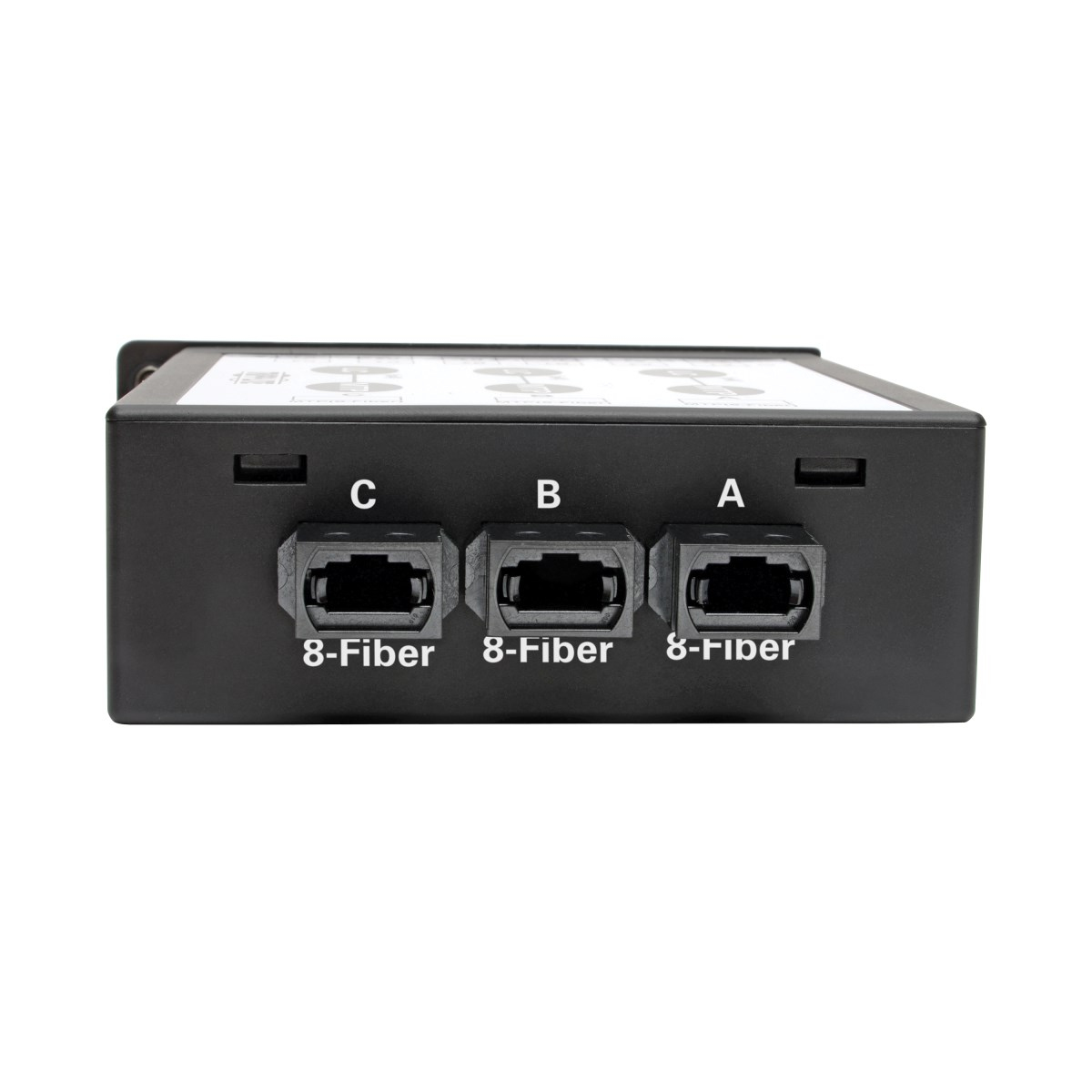 Die 9/125 N484-3M8L12S 40/100 Gb bis 10/25 Gb Singlemode-Glasfaser-Breakoutkassette wird zusammen mit dem Tripp Lite-Gehäuse N484-01U oder N484-00U betrieben, um 12 Duplex-LC-Glasfaserkabel mit drei 8-Faser-MTP/MPO-Anschlüssen zu verbinden. Ideal für die einfache, elegante und äußerst flexible Verbindung jeder Kombination von 10 Gb-, 25 Gb-, 40 Gb- und 100 Gb-Netzwerkgeräten, und kompatibel mit den empfohlenen Tripp Lite-Kabeln, einschließlich der N370- und N390-Serien. Die 8-Faser-MTP-Anschlüsse sind in Polarität B ausgeführt und für Parallel-Optik und Base-8-Konnektivität optimiert.