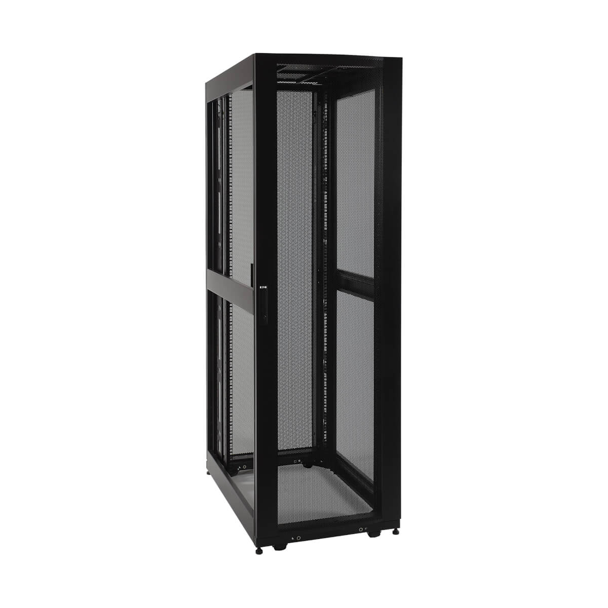 Das SR45UB bietet Platz für Standard-Rack-Geräte in 45U von 19 Zoll (482,6 mm) mit einem Gewicht von 1.588 Kilogramm (3.500 Pfund). Seine vorderen und hinteren vertikalen Schienenpaare haben quadratische Befestigungsbohrungen, die in Viertelzoll-Schritten von 4 (101,6 mm) bis 37 Zoll (939,8 mm) einstellbar sind. Die Einstellung erfolgt schnell, und ein übersichtlicher Tiefenindex gewährleistet eine konsistente Schienenplatzierung, ohne dass zeitraubende Messungen erforderlich sind. Jeder Rackplatz innerhalb des Gehäuses ist zur besseren Übersicht nummeriert.