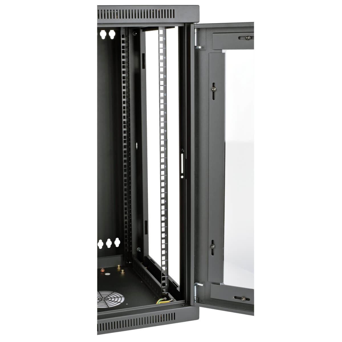 Der Schrank lässt sich mit einem robusten Scharnier von der Wand wegschwenken und ermöglicht so einen einfachen Zugang zu Geräten und Verkabelung während der Installation und Wartung. Um sicherzustellen, dass Ihre wertvolle Geräte sicher bleiben, werden die Türen und Seitenwände verriegelt. Die oberen, unteren und abnehmbaren Seitenwände sind belüftet, so dass die Luft frei durch das Rack strömen kann, um die Geräte kühl zu halten. Die umkehrbaren Türen können sich nach links oder rechts öffnen, indem der Schrank vor der Montage um 180 ° gedreht wird. Praktische Öffnungen von oben und unten ermöglichen eine einfache Kabelführung durch den Schrank.